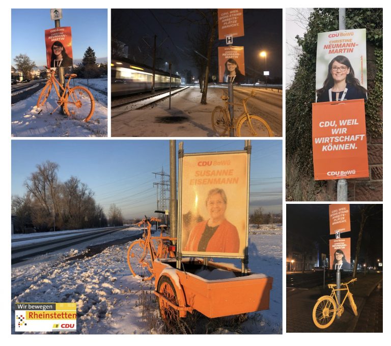 Von der CDU Waghäusel kam die Idee, mit den orangenen Fahrrädern die Bürger*innen auf sich aufmerksam zu machen – ab sofort können auch Sie mehrere orangene Fahrräder am Straßenrand in Rheinstetten entdecken.