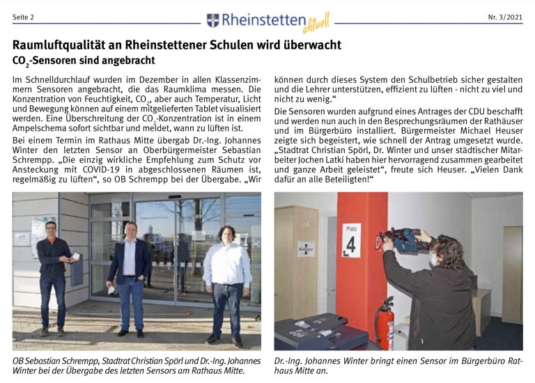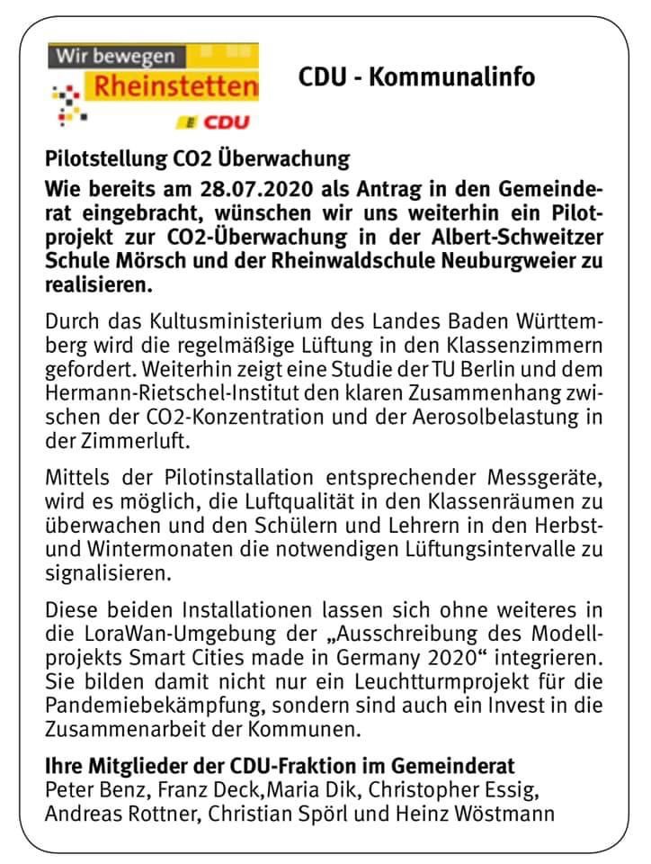 Der Antrag der CDU Gemeinderatsfraktion in der die Raumluftqualität an Rheinsettener Schulen überwacht werden soll wurde in guter und schneller Zusammenarbeit mit der Stadtverwaltung umgesetzt.