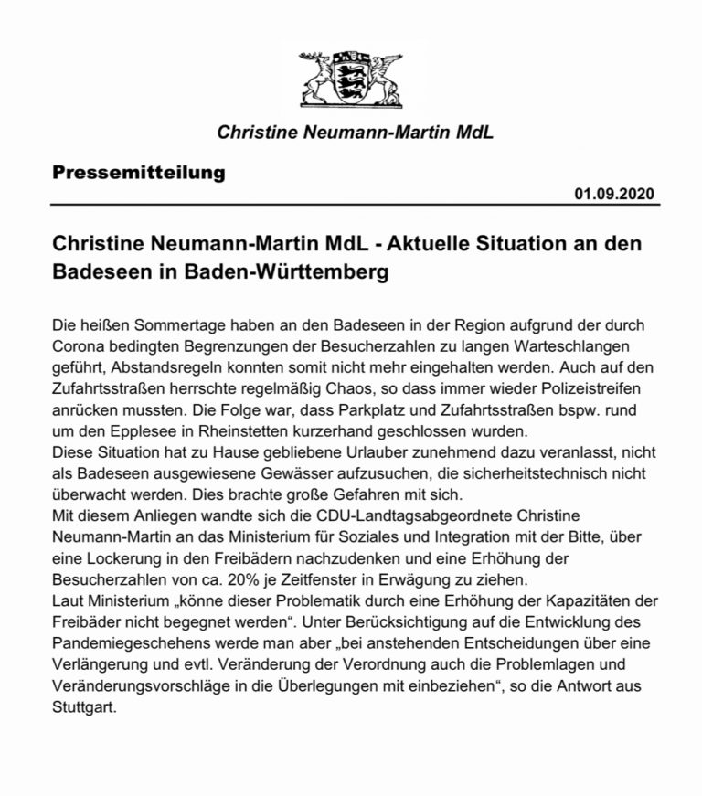 Auf die Anfrage von Christine Neumann-Martin beim Sozialministerium wegen der Erhöhung der zugelassenen Besucherzahlen in Schwimmbädern ist die Antwort bei uns eingegangen.