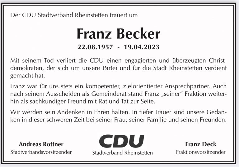 Nach kurzer, schwerer Krankheit verließ uns Franz Becker, in den schweren Stunden des Abschieds möchten wir den Hinterbliebenen von Franz Becker unser aufrichtiges Beileid aussprechen.