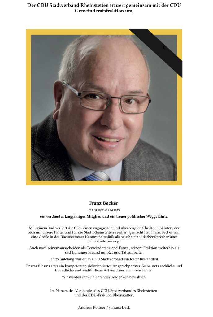 Wir nehmen in Dankbarkeit und Respekt Abschied von unserem engagierten und verdienten Mitglied Franz Becker