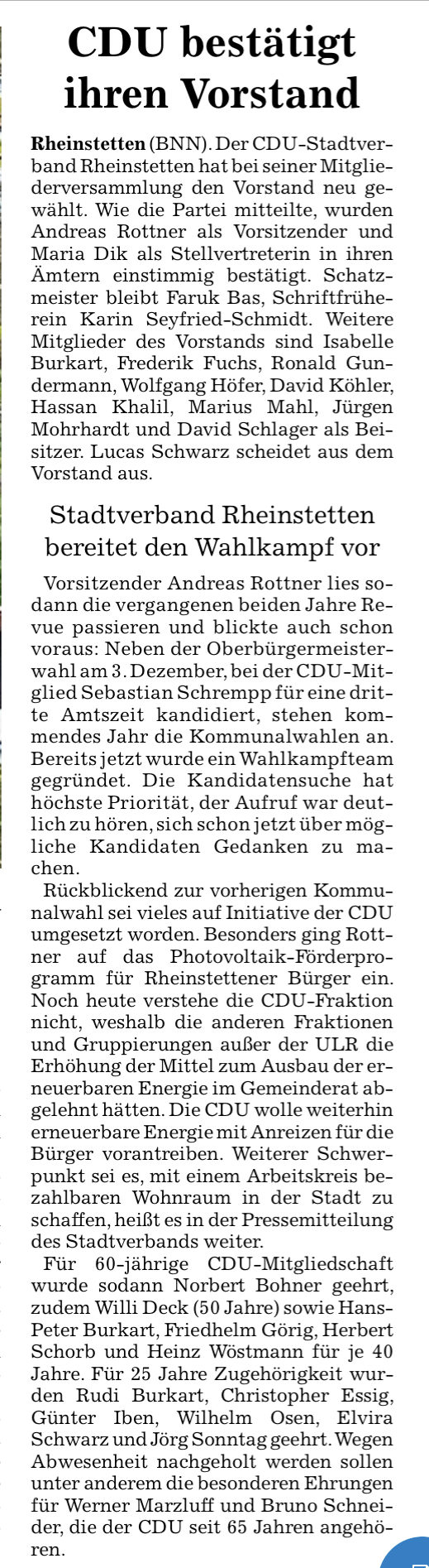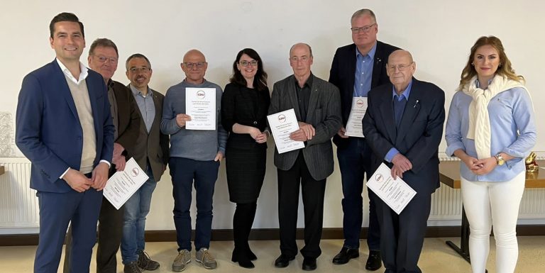 Bild: vlnr. Nicolas Zippelius, Willi Deck (50 Jahre), Vorsitzender Andreas Rottner, Hans-Peter Burkart (40 Jahre) Christine Neumann-Martin, Herbert Schorb (40 Jahre), Heinz Wöstmann (40 Jahre), Norbert Bohner (60 Jahre) und stv. Vorsitzende Maria Dik..