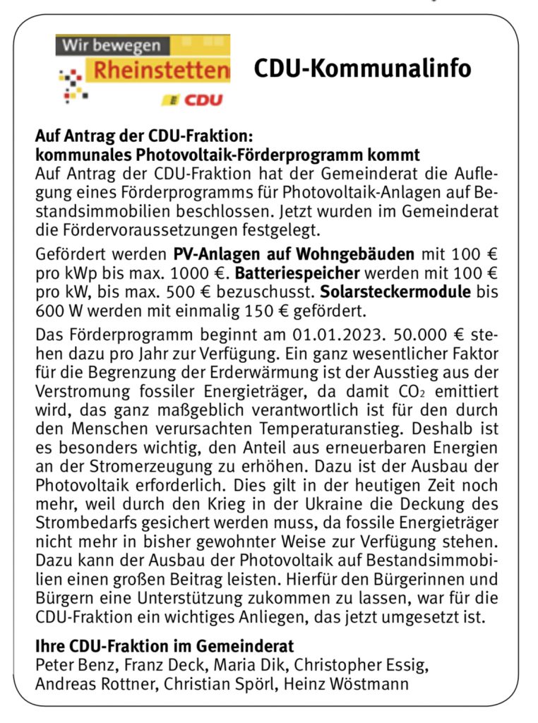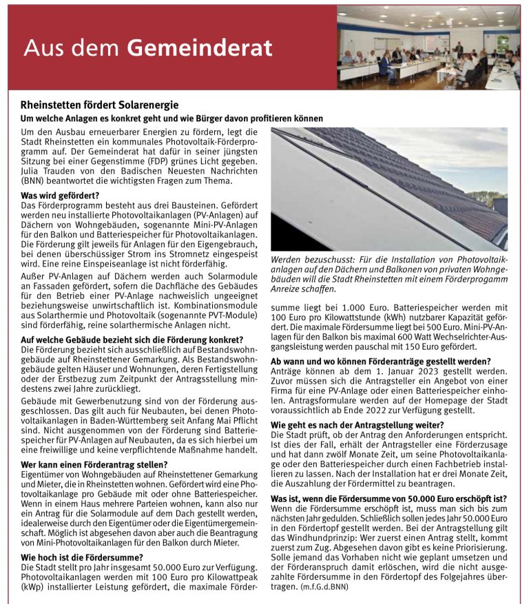 Die Stadt Rheinstetten wird mit dem Förderprogramm „Photovoltaik an Bestandswohngebäuden“ Eigentümer und Mieter von bestehenden Wohngebäuden auf Rheinstettener Gemarkung bei der Nutzung der Sonnenenergie zur Stromerzeugung und deren Speicherung bezuschussen. Antragsformulare werden auf der Homepage der Stadt voraussichtlich ab Ende 2022 zur Verfügung gestellt.