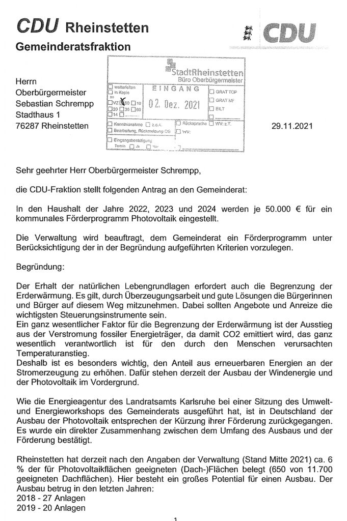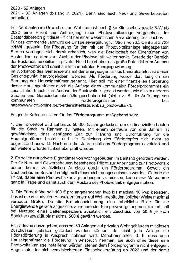 Damit möchte die Stadt Rheinstetten die aktuelle Förderlücke schließen und einen Anreiz schaffen, die bestehenden privaten Wohngebäude sinnvoll für die Energiewende und die dringend notwendige Reduzierung der CO2-Emissionen zu nutzen. Ebenso ist es sinnvoll, den Sonnenstrom direkt dort zu verbrauchen, wo er erzeugt wird und damit einen Schritt hin zu einer klimaneutralen Stadt zu gehen.