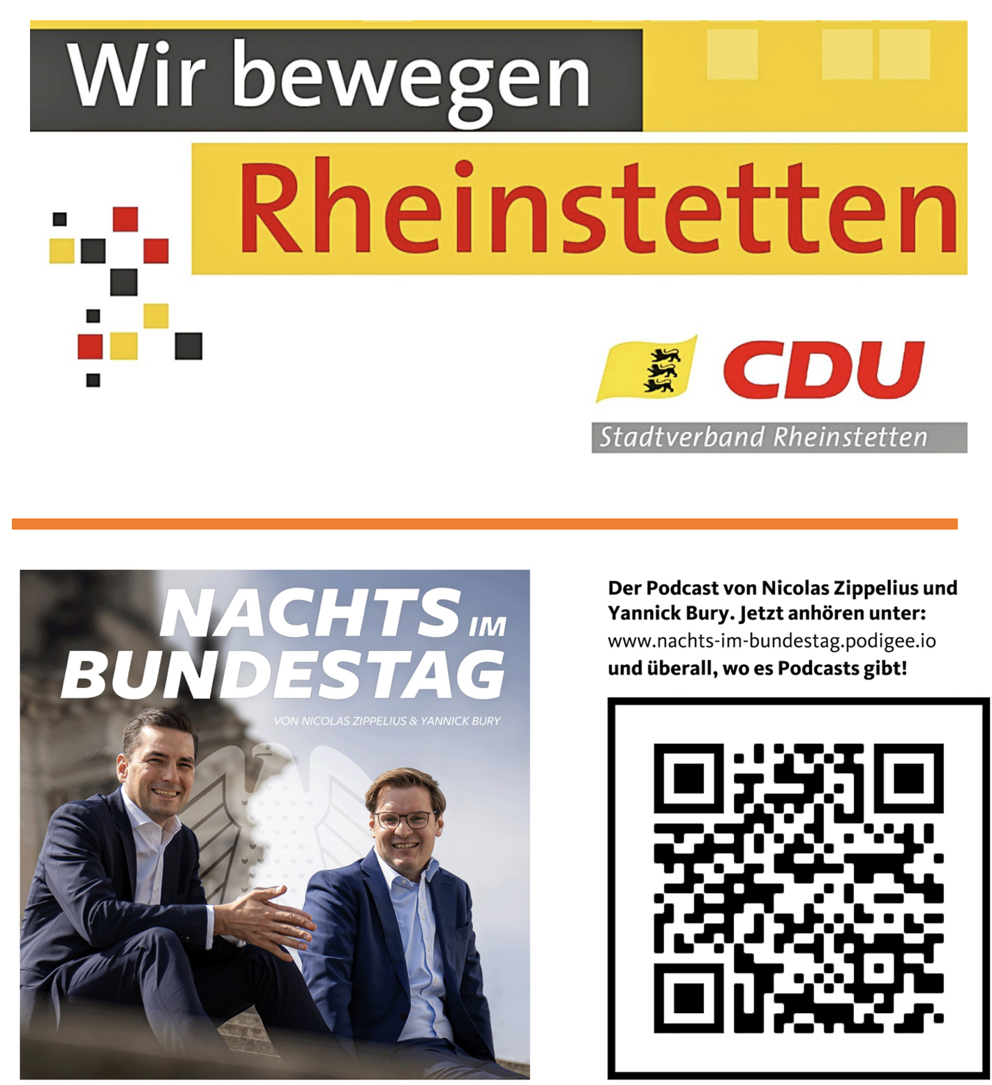 Nachts im Bundestag – der Podcast von Nicolas Zippelius und Yannick Bury. Zwei junge Bundestagsabgeordnete sprechen über ihre Arbeit in Berlin, persönliche Hintergründe und geben besondere Einblicke. Yannick Bury ist Wahlkreisabgeordneter für Emmendingen/Lahr. Regelmäßig nach einer Sitzungswoche erscheint der gemeinsame Podcast auf Spotify und kann auf podigee.io (Link über den QR-Code aufrufbar) angehört werden.