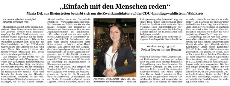 mit der stellvertretenden Stadtverbandsvorsitzenden Maria Dik möchte die CDU Rheinstetten in Zukunft eine stärkere Rolle im Kreisvorsitz der CDU Karlsruhe-Land einnehmen.