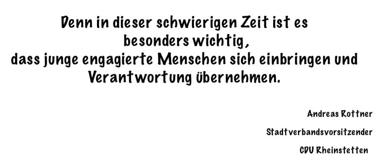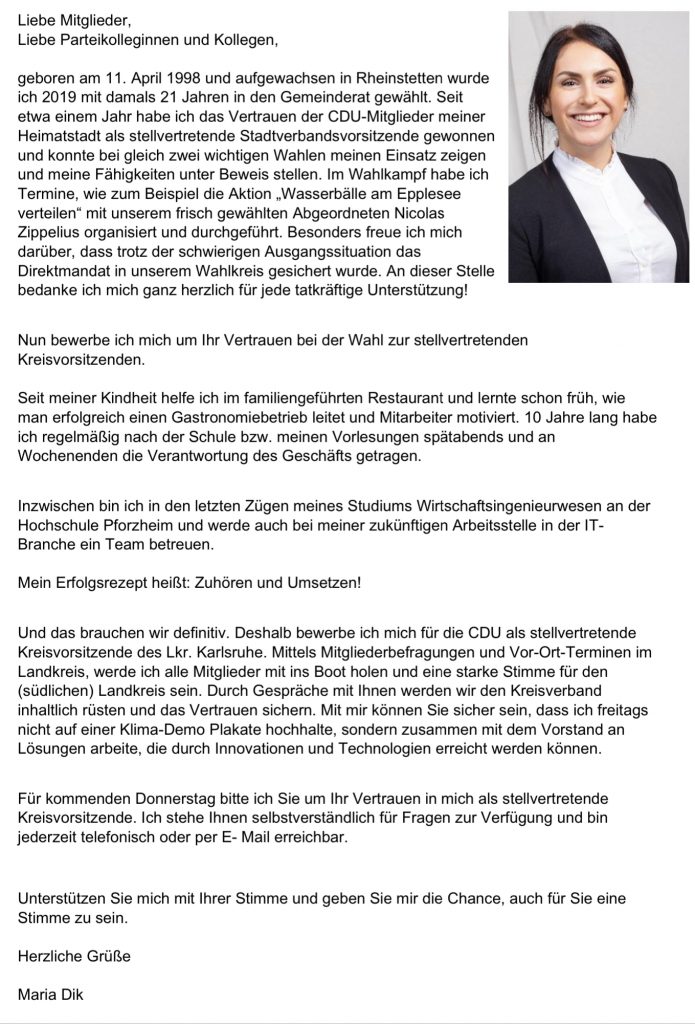 Wir würden uns freuen, wenn Sie die Kandidatur unserer jungen und motivierten stellvertretenden Stadtverbandsvorsitzenden mit Ihrer Stimme unterstützen, und damit helfen mit neuem Schwung einen Veränderungsprozess bei der CDU im Landkreis Karlsruhe einzuleiten.